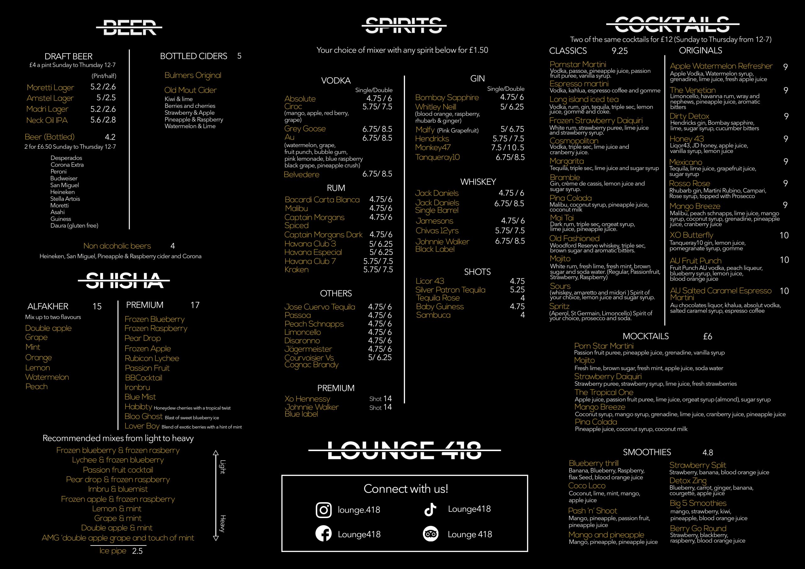 So come on down to Lounge 418 and experience the pleasure of smoking shisha. We look forward to seeing you soon.